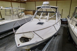 POWERBOAT GUIDE DESCRIPTION: A revised version of the Albemarle 280 Express, the Carolina Classic 28 evolved when former Albemarle employee Mac Privet started Carolina Classic in 1992. Construction is solid fiberglass, and her wide 10'6" beam results in a very roomy cockpit. In spite of the fact that she’s a dedicated fishboat, the 28 has a surprisingly complete cabin below with a big V-berth, standup head with shower, compact galley, air-conditioning, and teak-framed joinery. The engines are very accessible—the entire bridge deck can be raised on a pair of hydraulic rams at the push of a button. The cockpit has plenty of room for a mounted chair and includes a pair of in-deck fish boxes, rod holders, transom livewell, tackle center with sink, and fresh- and saltwater washdowns. Additional features include side-dumping exhausts, wide side decks, high gunwales, and a well-arranged helm with room for flush-mounted electronics. Among several engines offered over the years, twin 300hp Volvo gas engines (with jackshafts) will cruise at 25–26 knots. Twin 250hp inboard Cummins diesels cruise at 25 knots (30+ top), and 330hp Cummins cruise at 30 knots (mid 30s top).
