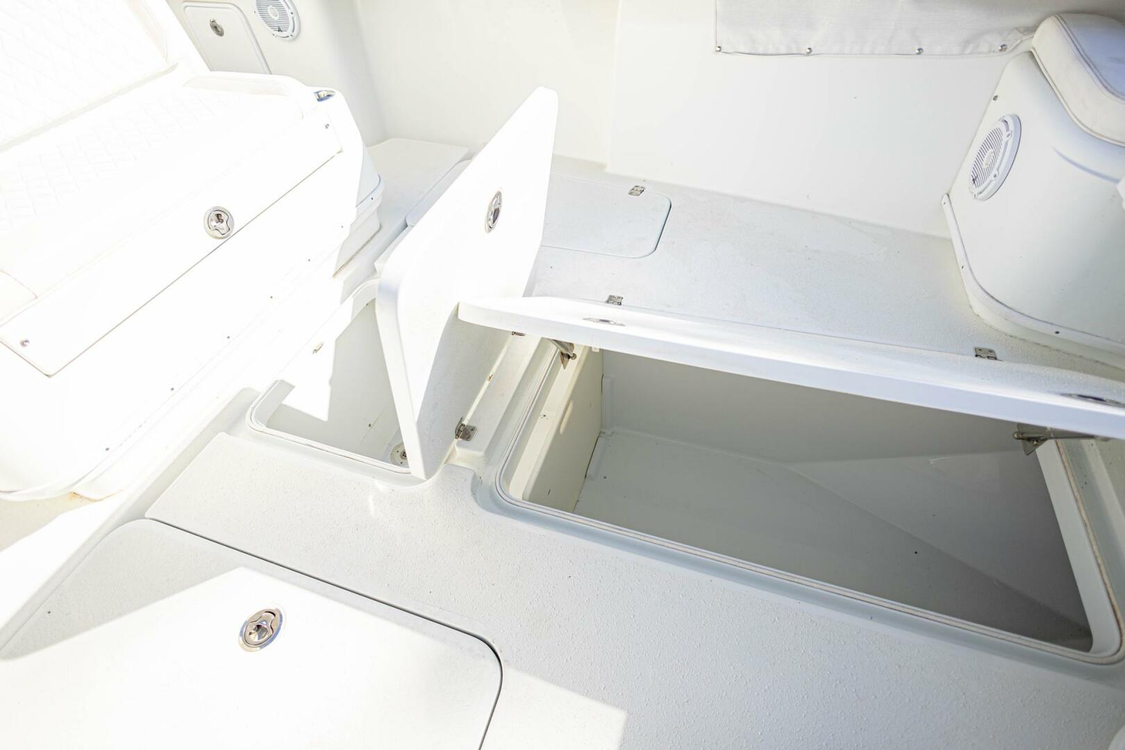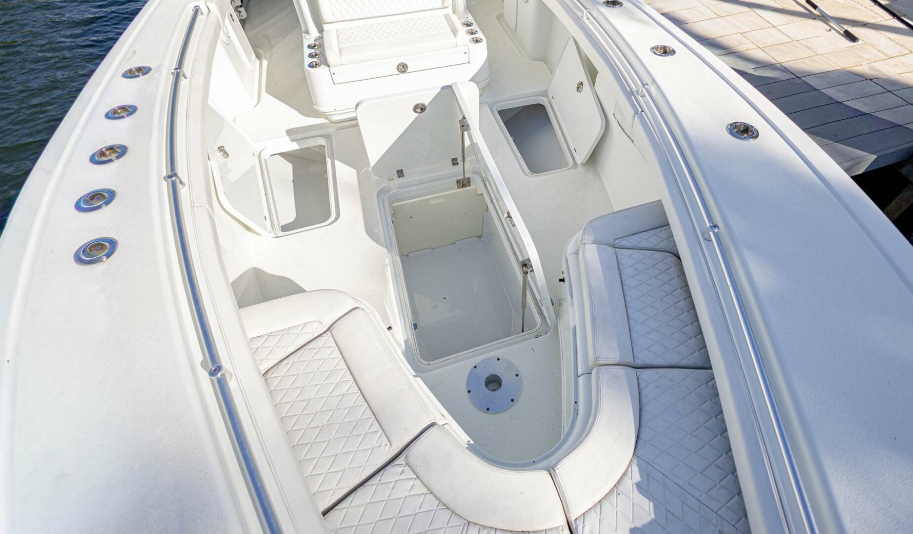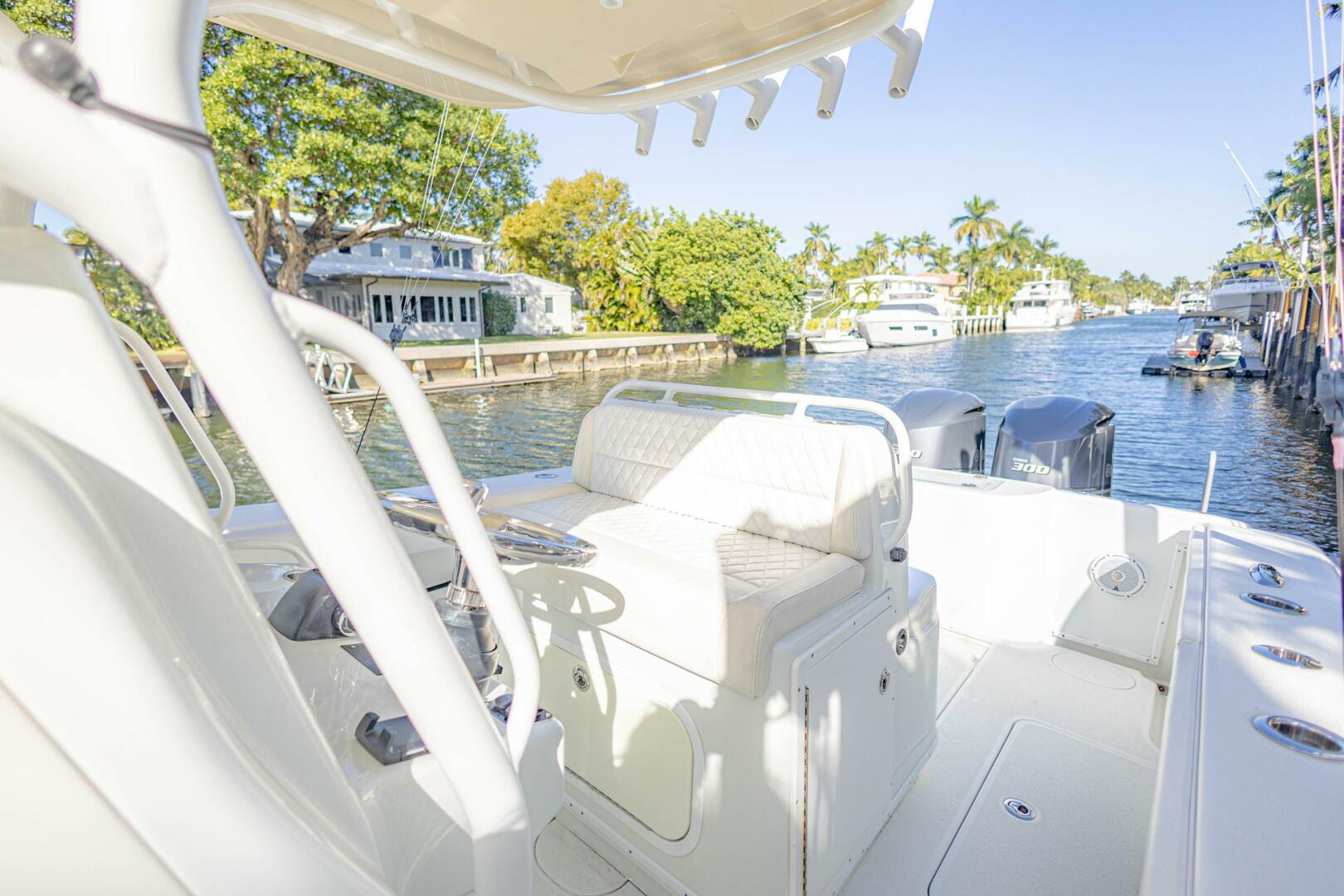 The 32' Yellowfin 2015 is an ideal boat for those seeking a stylish and high-performing vessel. It features a sleek design with a powerful engine that makes it fast and responsive on the water. With its easy-to-handle design, even in rough seas, and comfortable seating, and spacious deck, the 32 Yellowfin brings an extra level of luxury to boating. The sharp bow entry and aggressive 22 degrees deadrise at the stepped transom gives it optimal performance while its low-profile bow rail, flush-mounted hardware, and infused nonskid enables 360 degrees of maneuverability. The bow centerline deck also has a large enough dry box as well as two more dry boxes located on the forward deck. Additionally, beneath the bow covering boards is a recessed shelf that can be used to store life jackets or other gear. The 32 also comes with twin live wells – a 100-gallon pressurized tank integrated into the leaning post and an additional 50-gallon tank in the transom – as well as twin saddle fish boxes each with 600 quarts capacity tucked away in the cockpit deck. If you're looking for a luxurious yet high-performance boat experience, look no further than the 32' Yellowfin 2015! This 32' Yellowfin is a fine as they come on the brokerage market.Set up as a custom yacht tender with forward seating, hard top, and tow eye.Only 575 hours on Yamaha 300s. Dual garmin GPS/ Radar/ Depth Sounder.