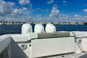 The 2021 Caymas 34 CC is praised for its smooth ride, impressive handling, and ample fishing features, including a well designed console inside, Mercury power, and Garmin electronics. Owners highlight its performance capabilities, with speeds exceeding 50 mph, and its comfortable design for both fishing and family outings. It features a unique Michael Peters SVVT hull design that enhances performance and stability.
