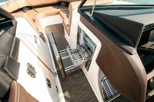 Docking is stress-free thanks to the Helm Master EX joystick system by Yamaha Motor Company, trim tabs, windlass with all chain, and bright docking lights. The glass cockpit with a Garmin 8612 display keeps navigation simple, while premium sound with transom speakers, RGB interior lighting, refrigerator, and quilted upholstery make every outing comfortable and fun.