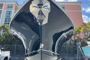 Factory upgraded twin Yamaha F250 engines with 107 hours and joystick steering package give this boat a performance advantage. Polished black hull, powder coated aluminum and 3 sided glass windshield give her a bold and mission ready look. The stylish console features Yamaha digital display, autopilot and joystick controls. Dual 12" Garmin touch screens, JL Audio stereo, Lenco electric trim tabs, wireless phone charger and illuminated rocker switches look great against the black acrylic backplate. The cushions, bolsters and black powder coated aluminum look new as well. Factory remote...
