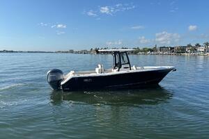 Factory upgraded twin Yamaha F250 engines with 107 hours and joystick steering package give this boat a performance advantage. Polished black hull, powder coated aluminum and 3 sided glass windshield give her a bold and mission ready look. The stylish console features Yamaha digital display, autopilot and joystick controls. Dual 12" Garmin touch screens, JL Audio stereo, Lenco electric trim tabs, wireless phone charger and illuminated rocker switches look great against the black acrylic backplate. The cushions, bolsters and black powder coated aluminum look new as well. Factory remote engine flush and complete boat sea deck covering make this Sea Hunt stand out. The electric anchor windlass and port side tuna door make anchoring and entry easy. This boat really does it all.