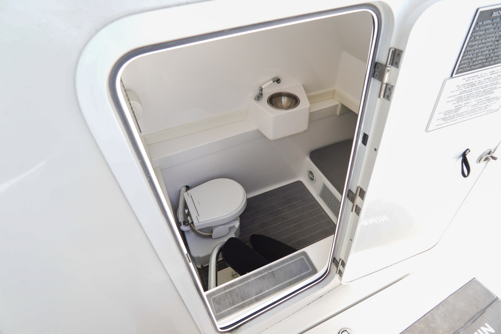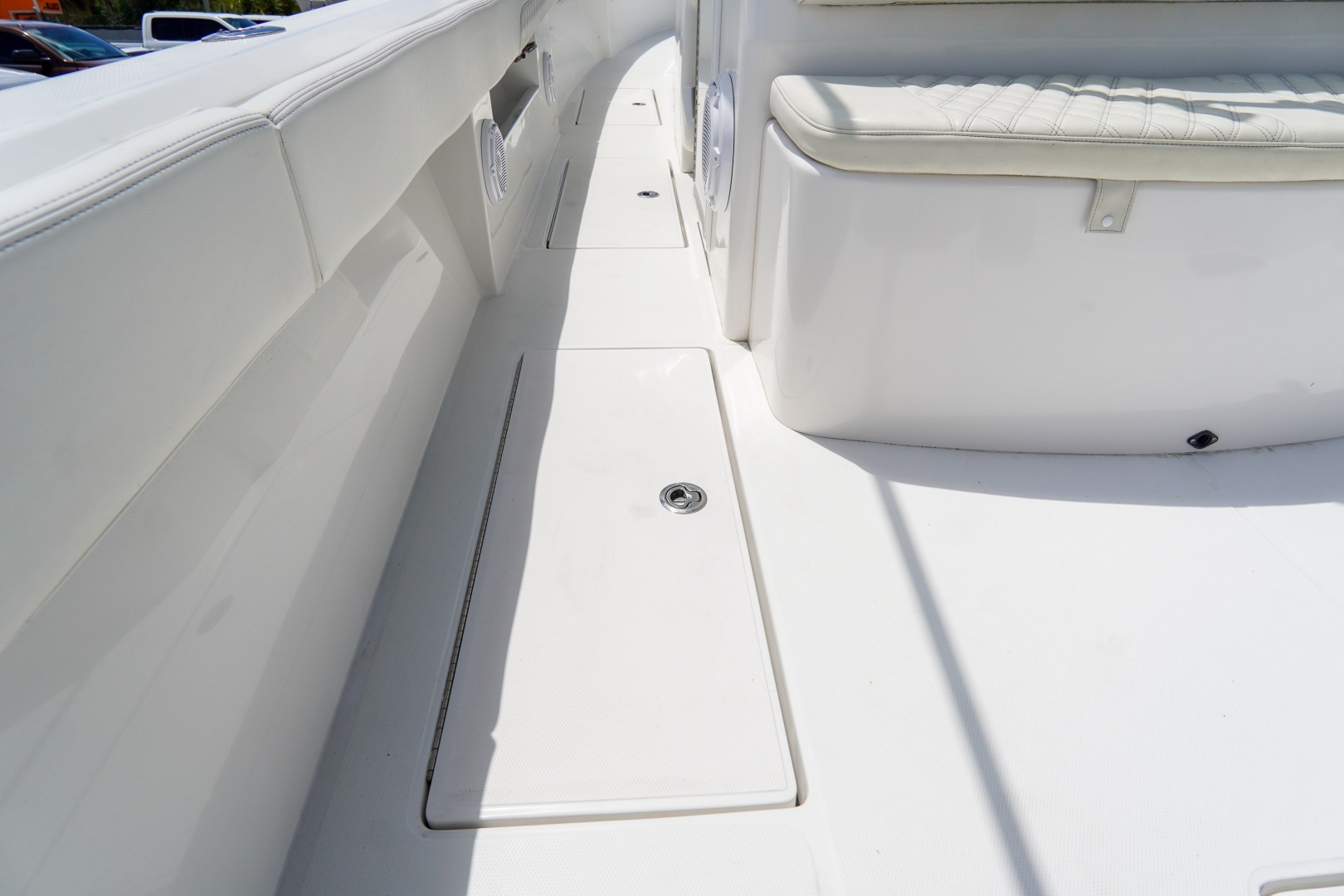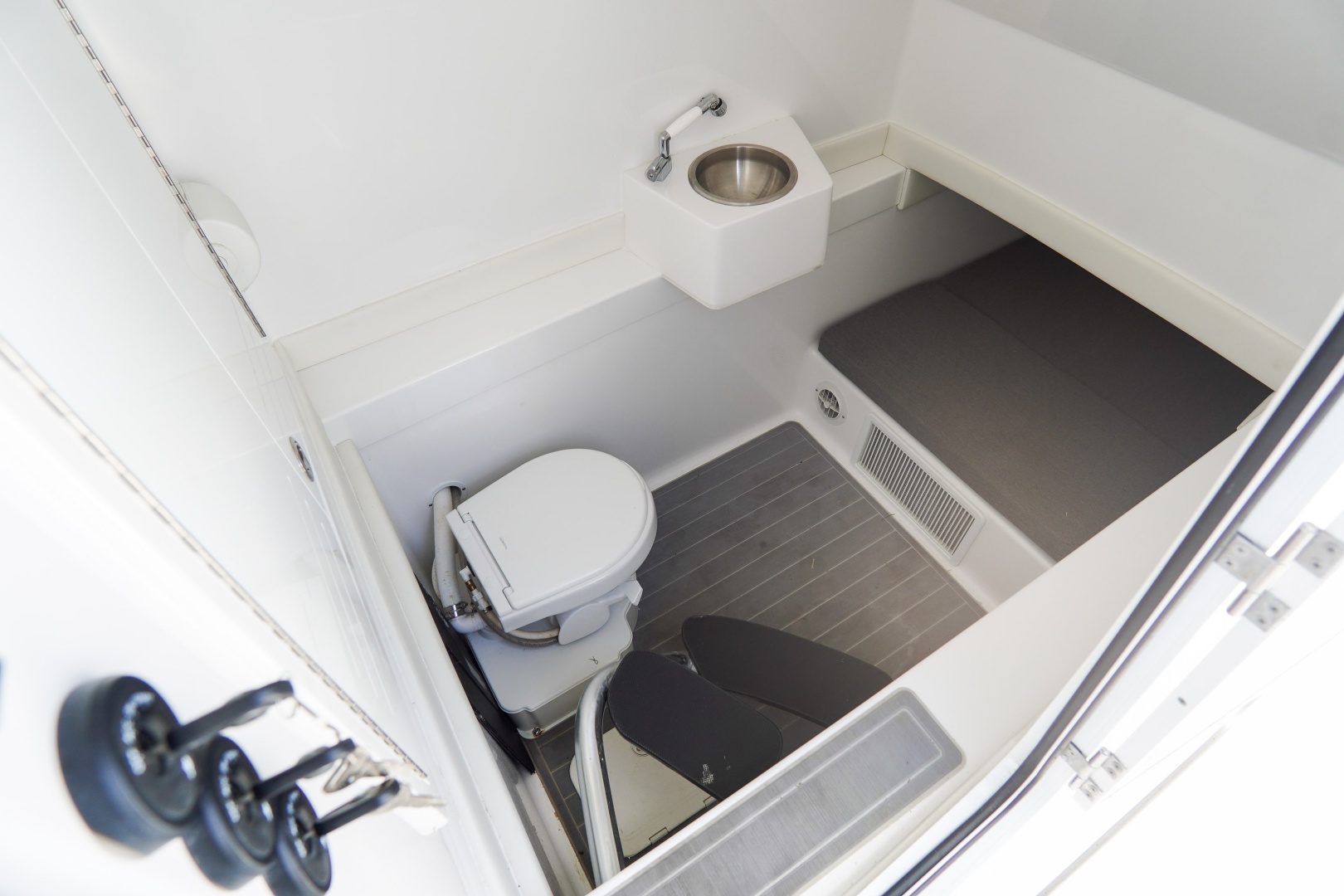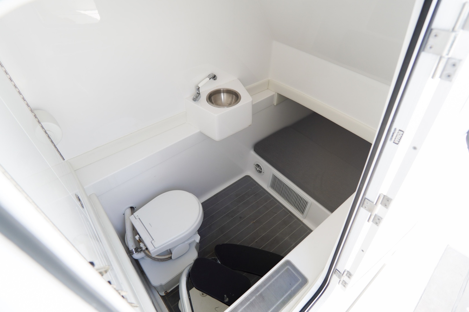 Comfort is equally impressive. The spacious center console cabin offers generous shade and airflow, featuring a stand-up head, shower, large berth, and 12V air conditioning—making it feel like a much larger yacht. On deck, enjoy features like a summer kitchen, molded rear seating, sun lounger bow seating, SeaDek flooring, and a side dive door with ladder for easy water access.