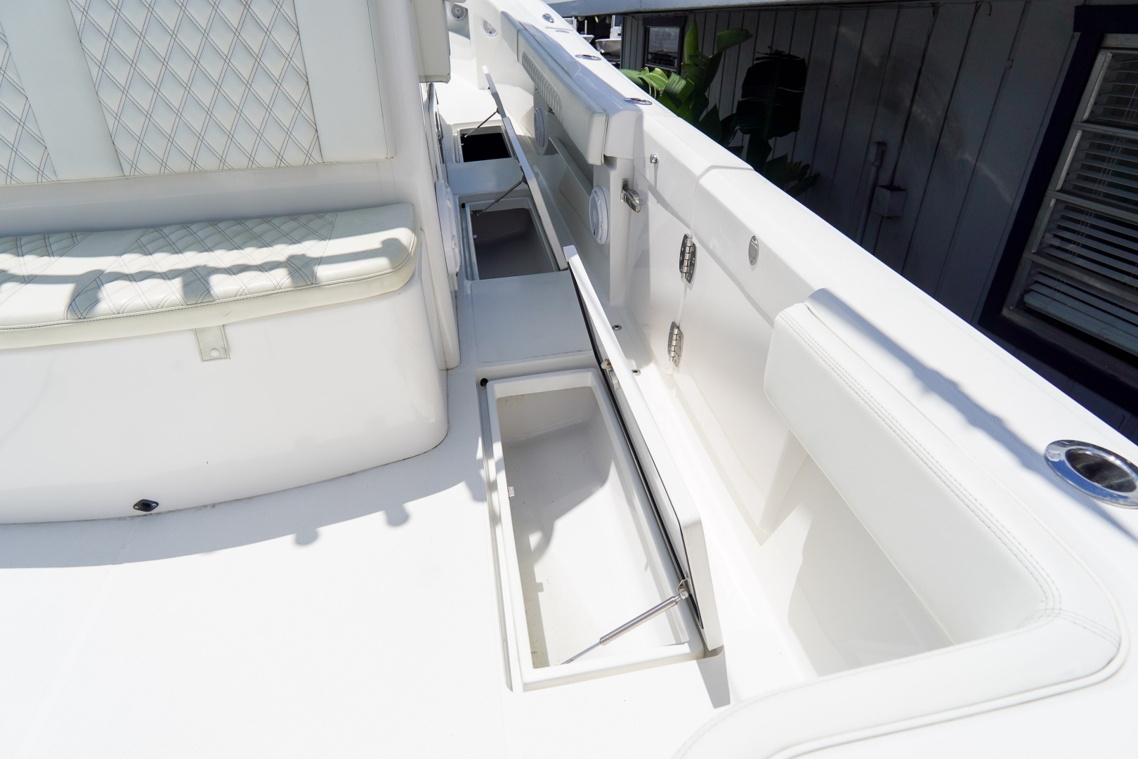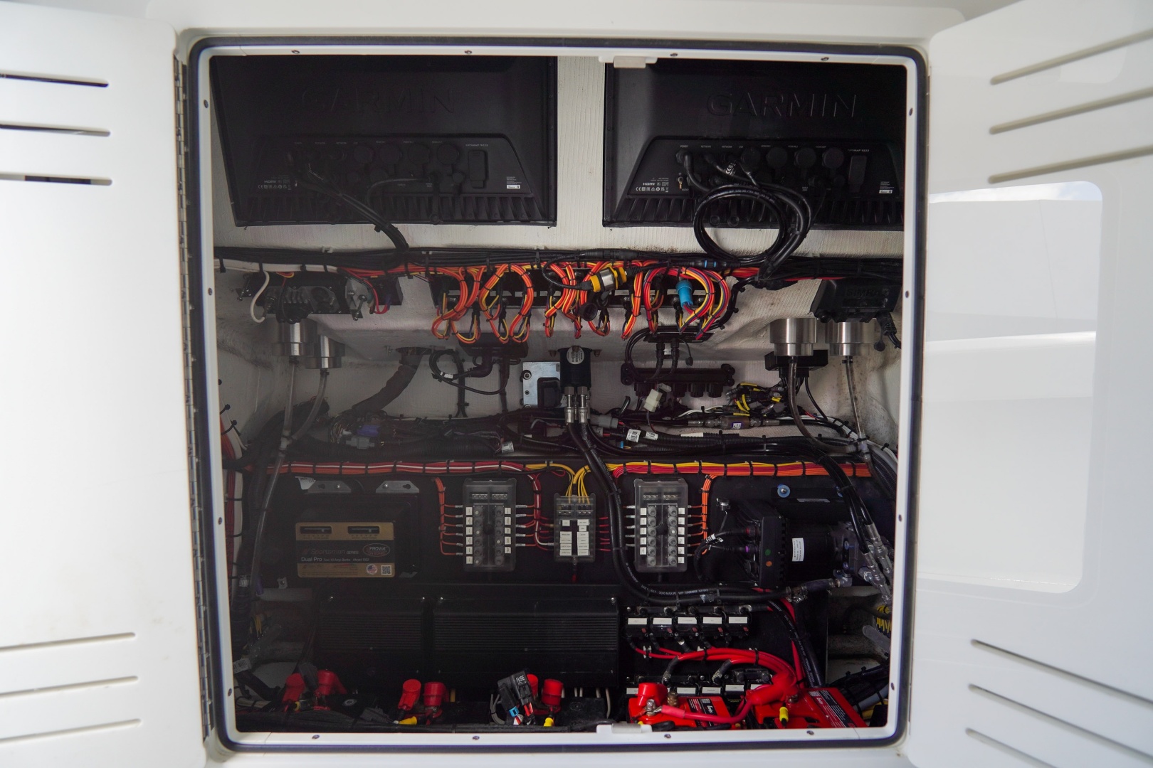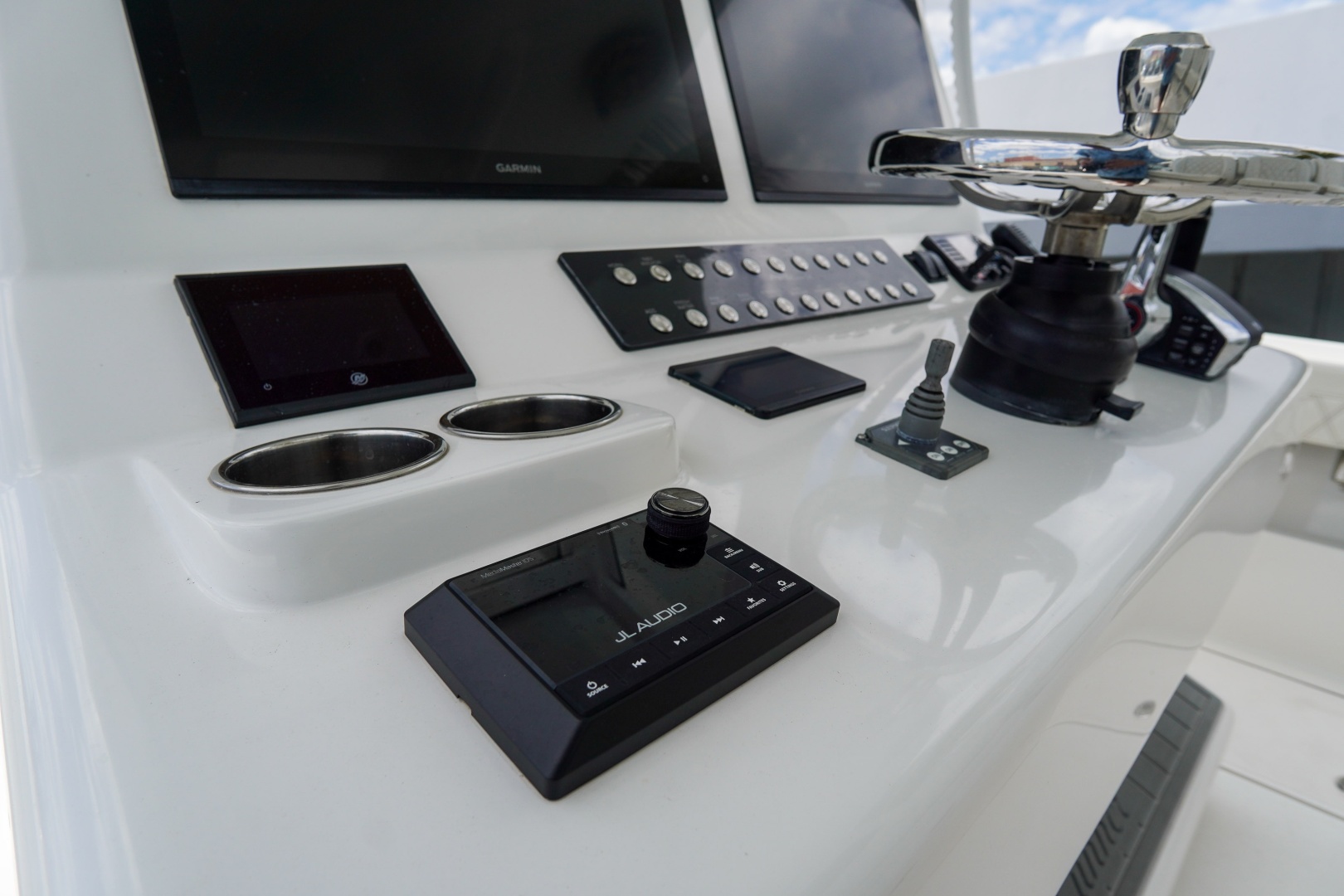 At the helm, you’ll find a fully equipped Garmin electronics package featuring dual 22” Garmin 8622 displays, multiple radar options, FLIR night vision, autopilot, and a high-performance CHIRP sounder system. A Seakeeper 3 gyro stabilizer provides unmatched comfort by reducing roll, while LED underwater lighting enhances both visibility and style.