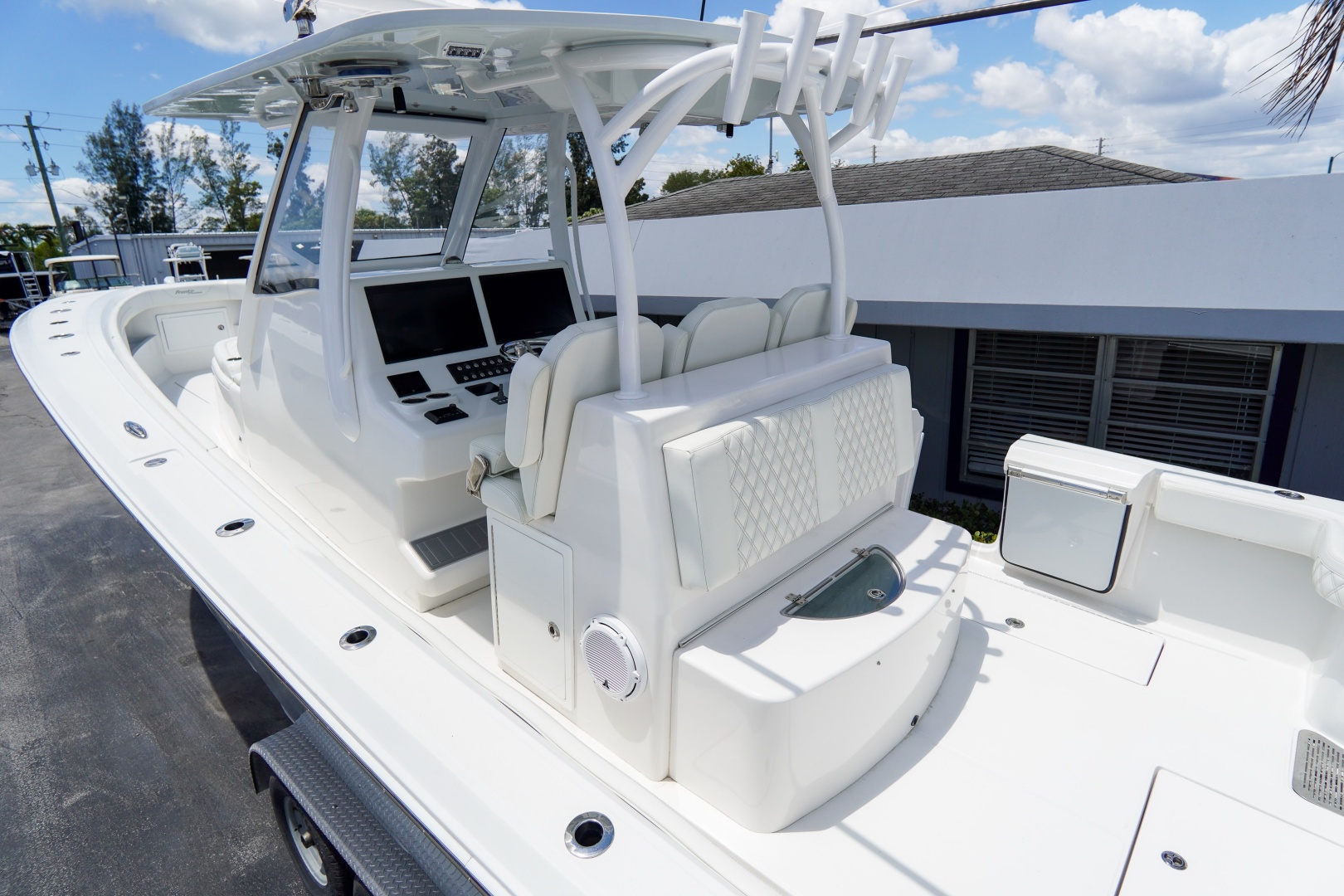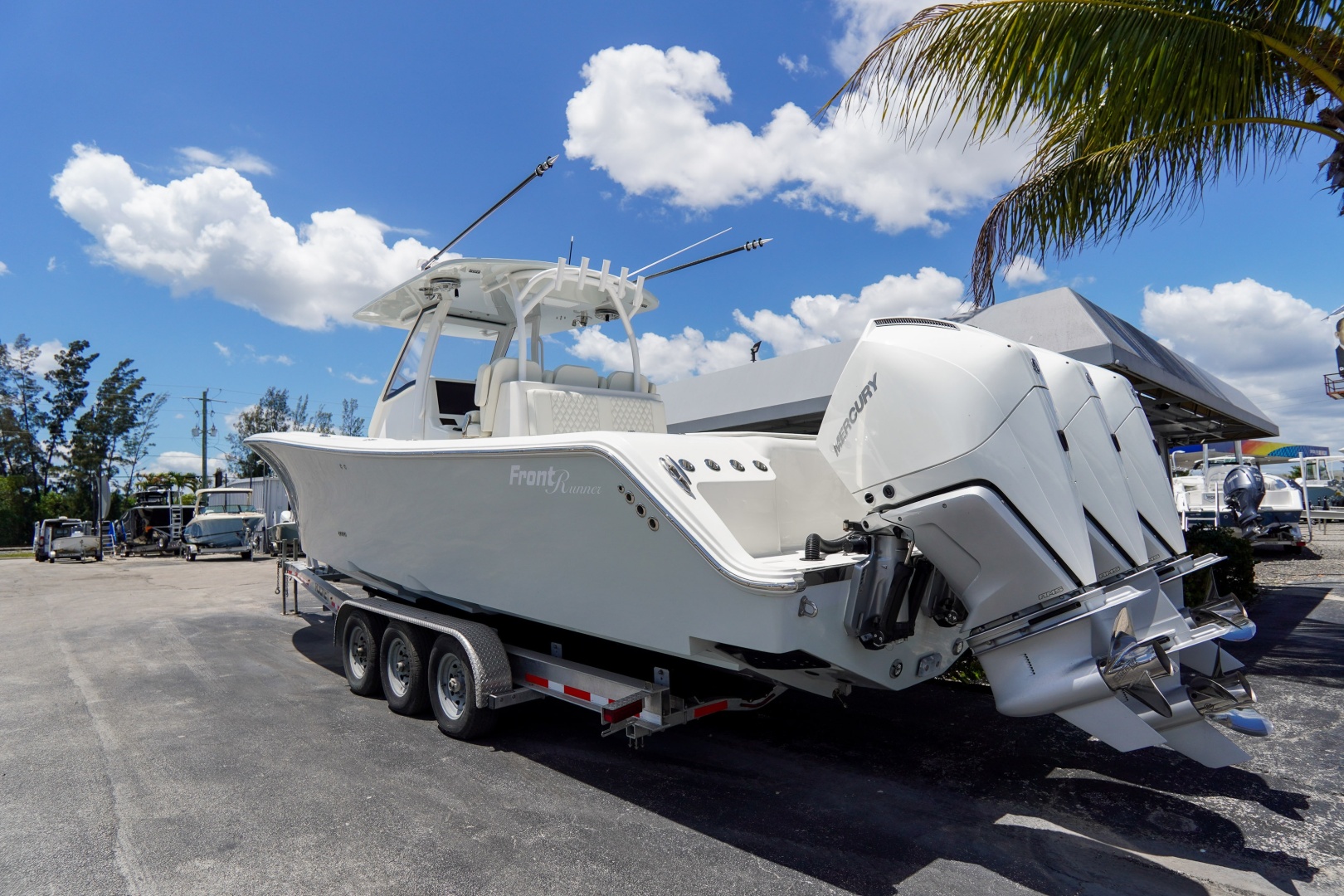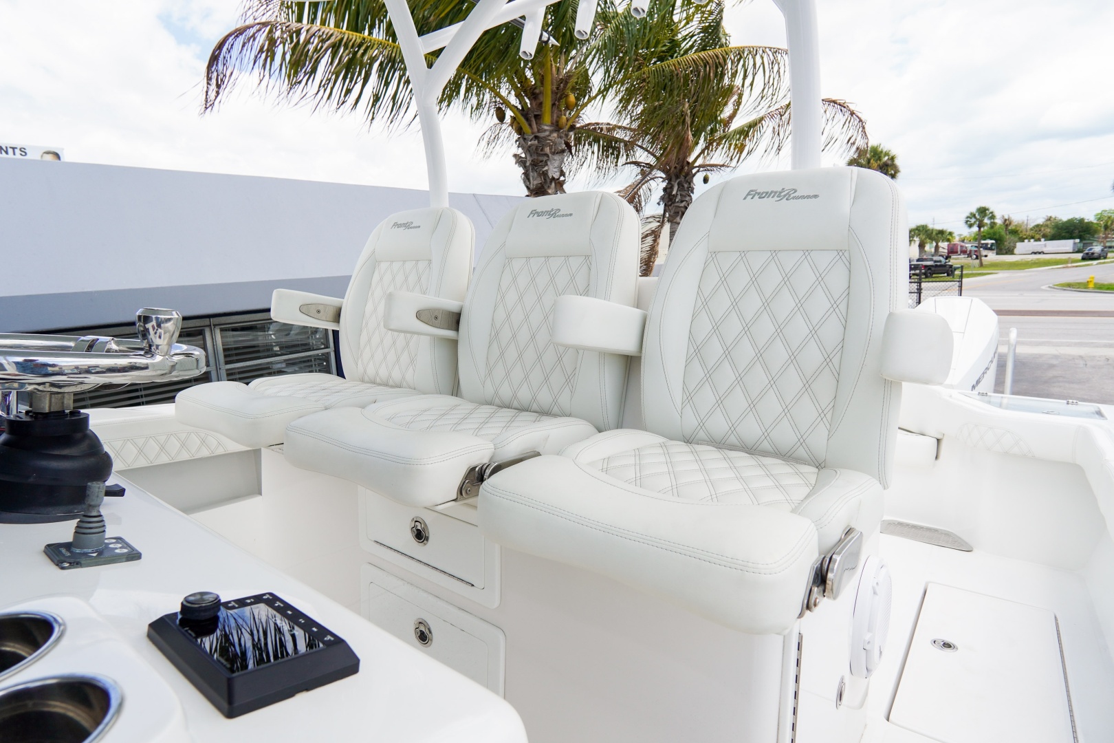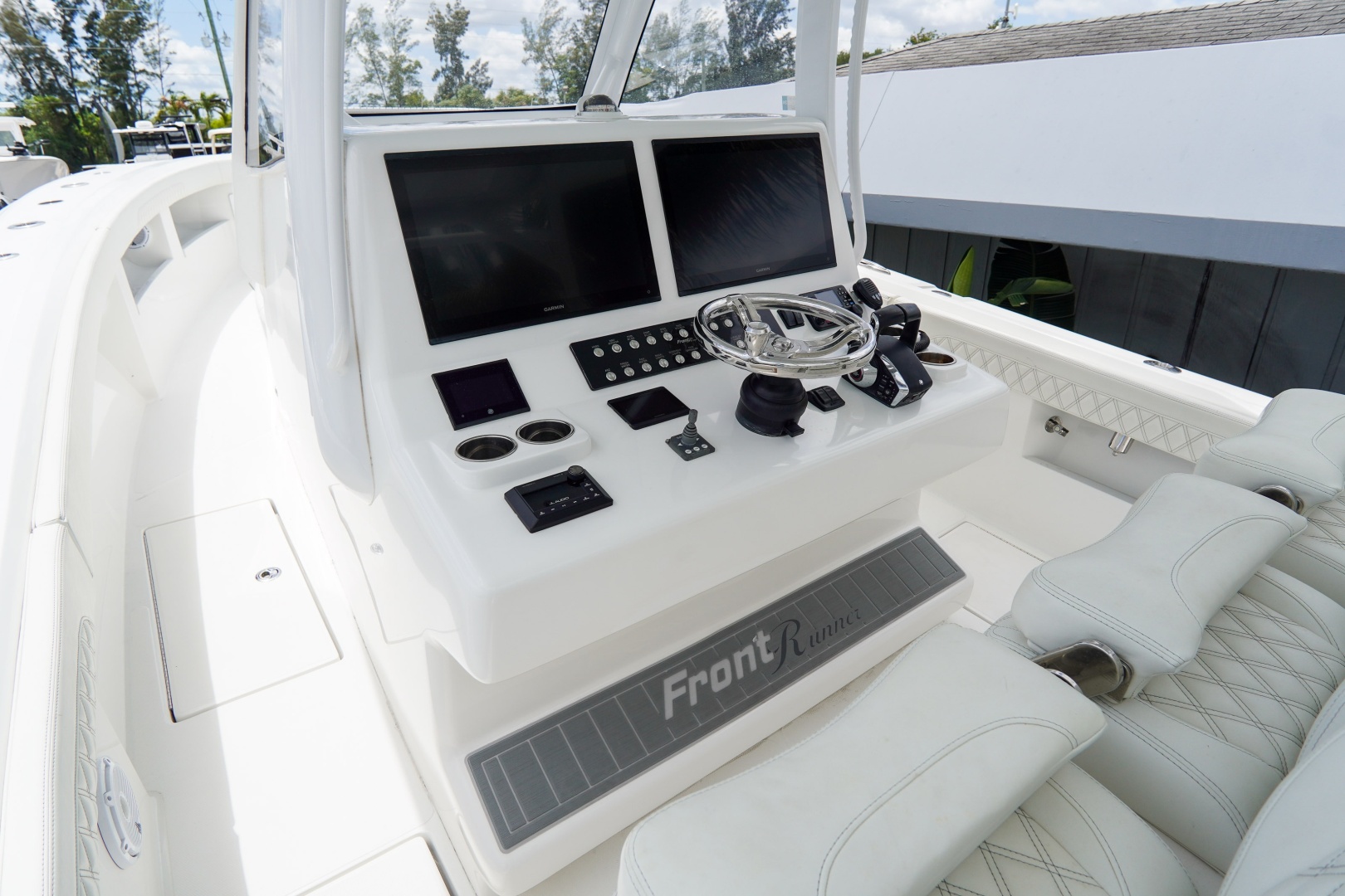 Finished with a striking two-tone hull, matched hardtop underside, and triple white engines, this 36 Front Runner delivers both head-turning style and serious offshore capability.