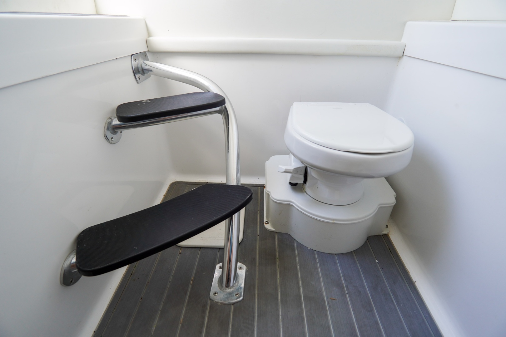 Additional premium upgrades include a teak helm chair, bow thruster, electric flush toilet with macerator, Lumitec LED light bar, windlass anchor system, powder-coated components, hard windshield, and a fully upgraded sound system with multiple speakers, subwoofers, and amplifiers.