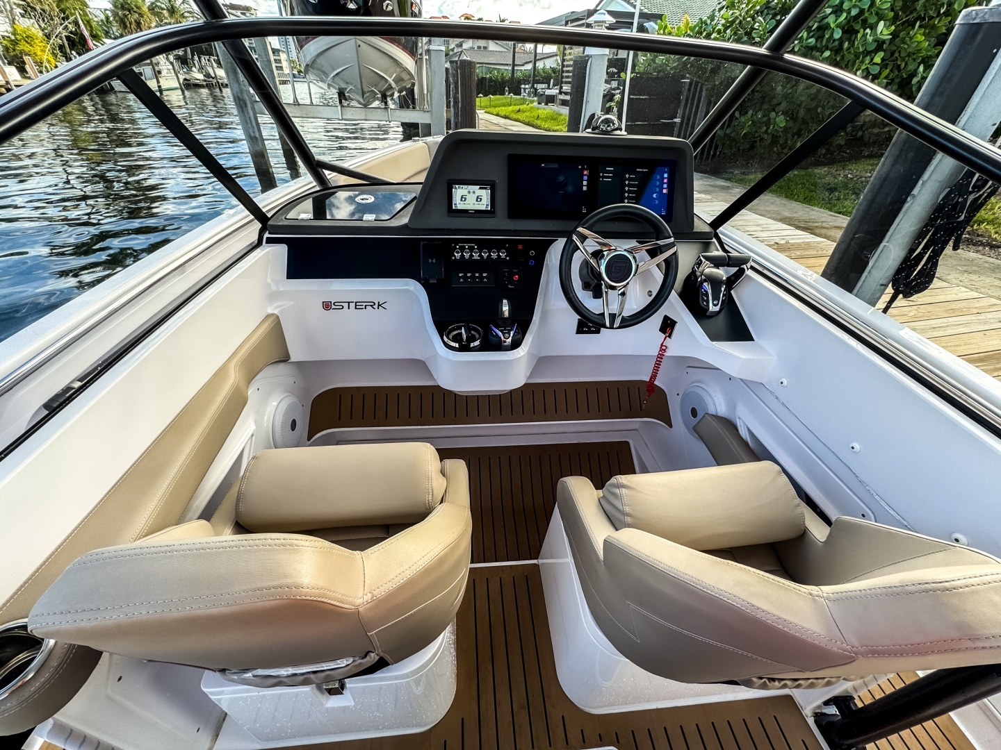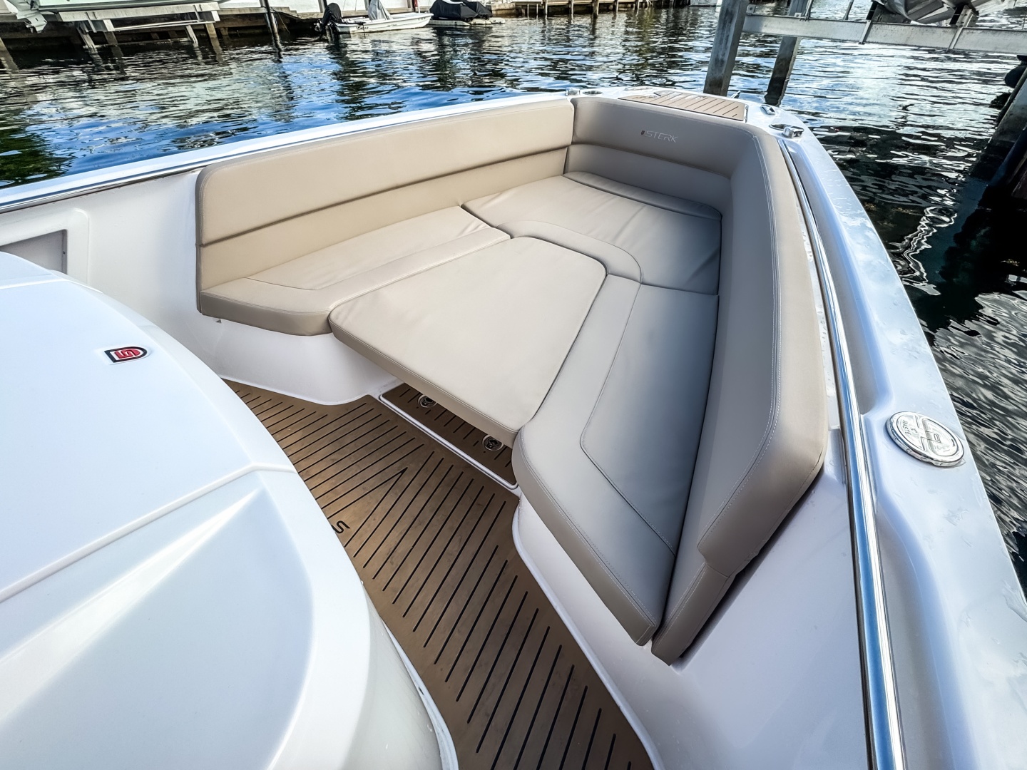The progressive hull of every STERK is optimized for maximum speed and agile handling. Extensive CFD testing ensures safe, precise control. The double-stepped, deep-V hull with strategically placed spray rails increases lift and reduces spray. A new and unique feature is the hook rails at the stern, which, along with negative chines, provide superior grip, reduced heeling, and high cornering stability—a STERK signature.