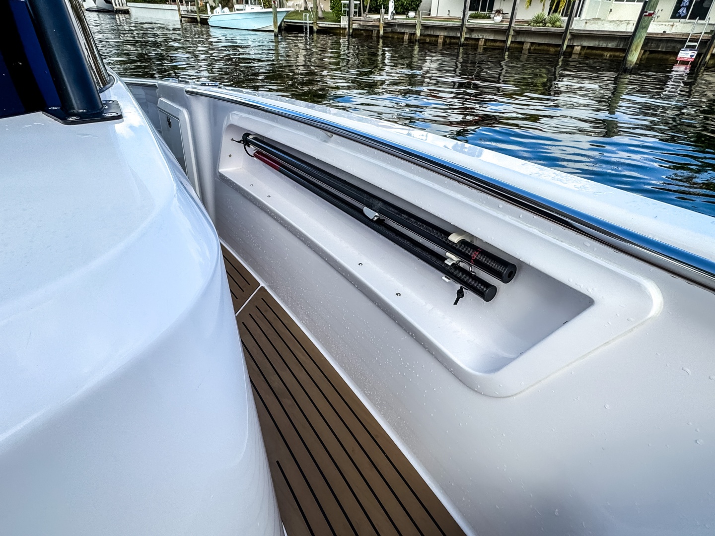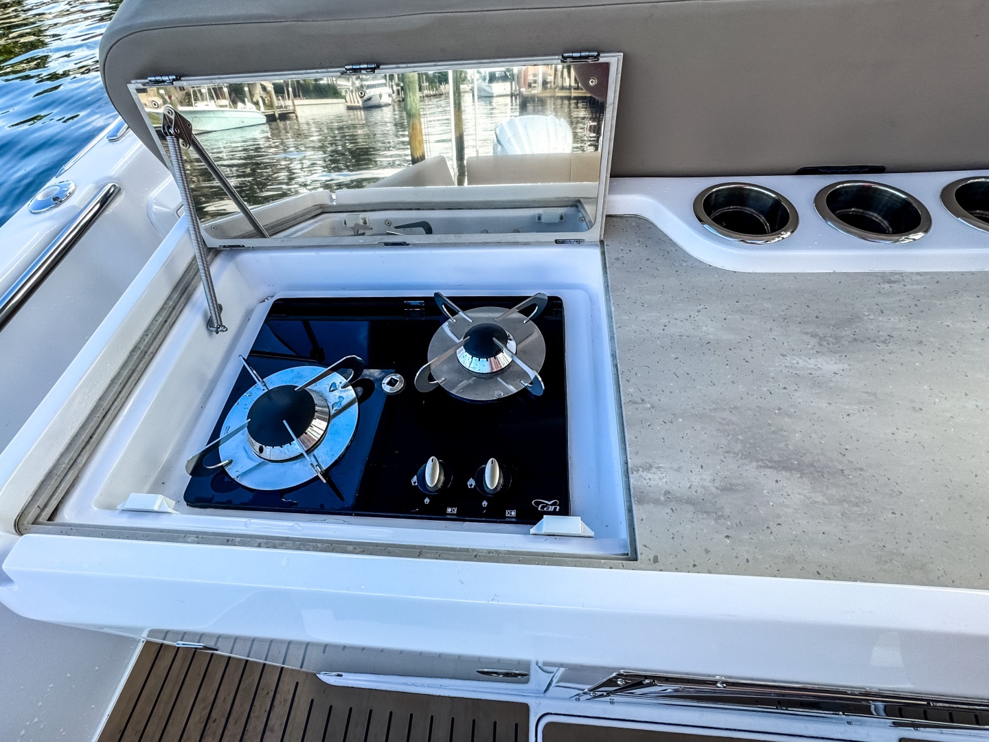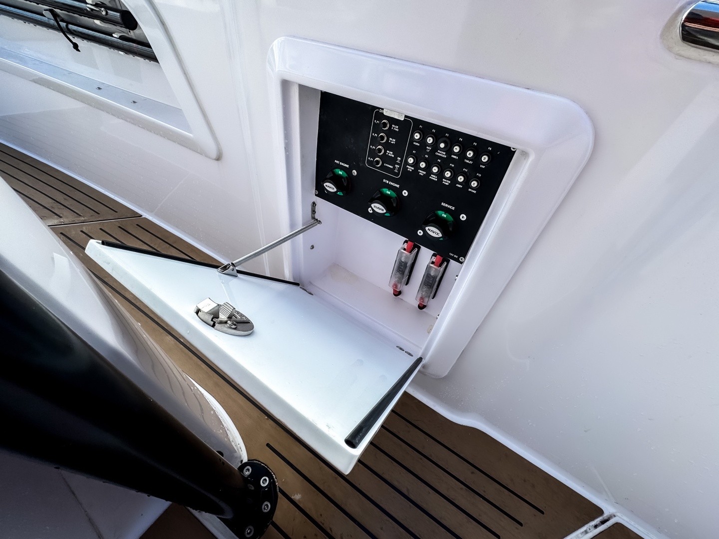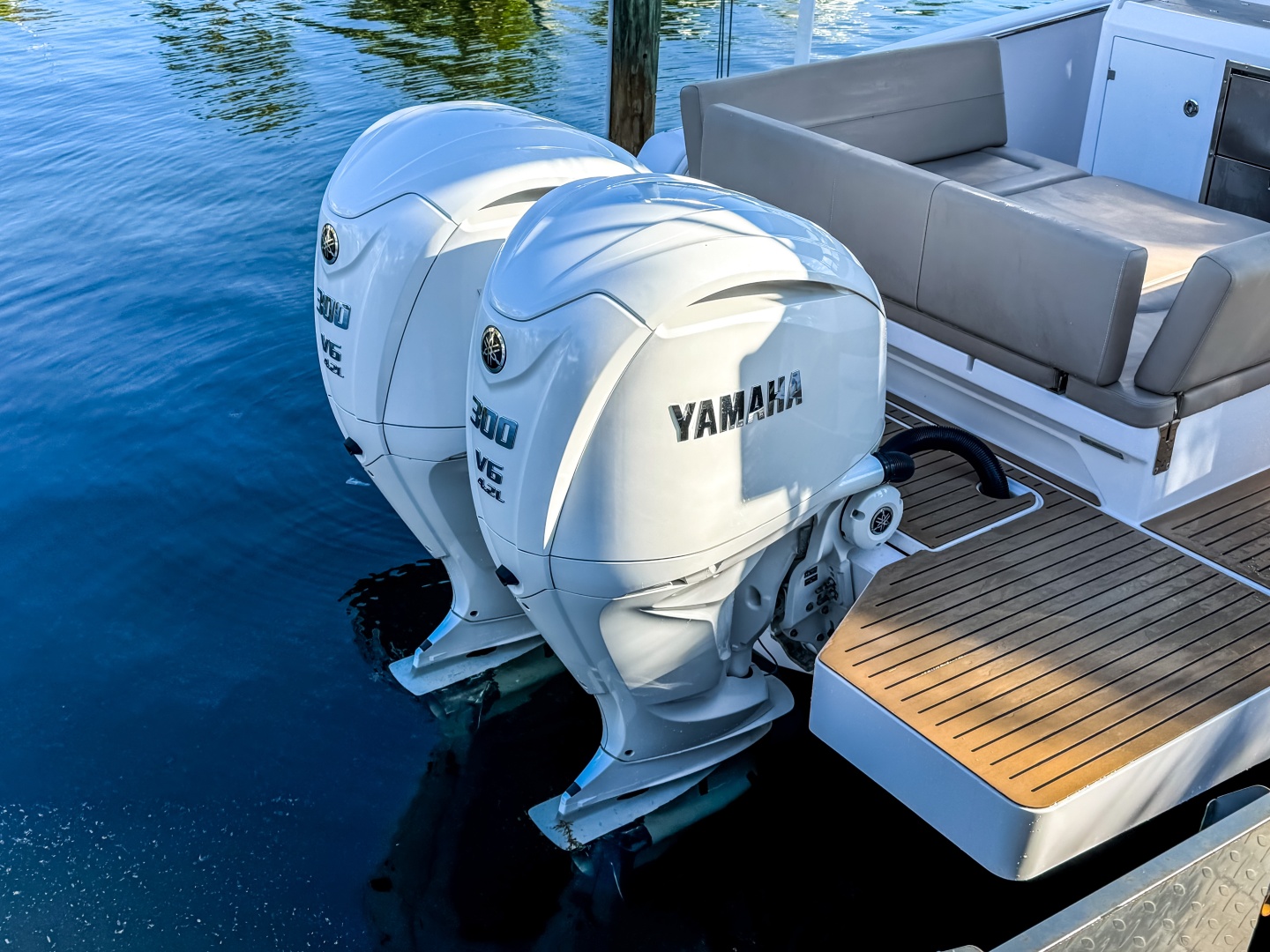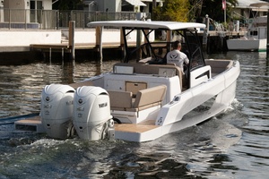 Finished in classic white with silver accents, almond Nautilus upholstery, and EVA soft-teak decking. Equipped with a full electrical system, triple bilge pumps, a C E-certified tank, and a foldable ladder.