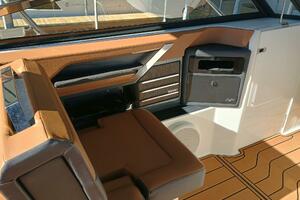 For safety and convenience, the boat is equipped with Splash & Stow, a stainless steel swim ladder, swim platform lighting, and underwater lights. The bow filler cushion and cabin cushion insert provide additional comfort, and the solid teak dinette table adds a touch of elegance. Finally, an upgraded battery charger for the bow thruster and an automatic fire suppression system ensure peace of mind while on the water, complemented by active trim for optimal performance.