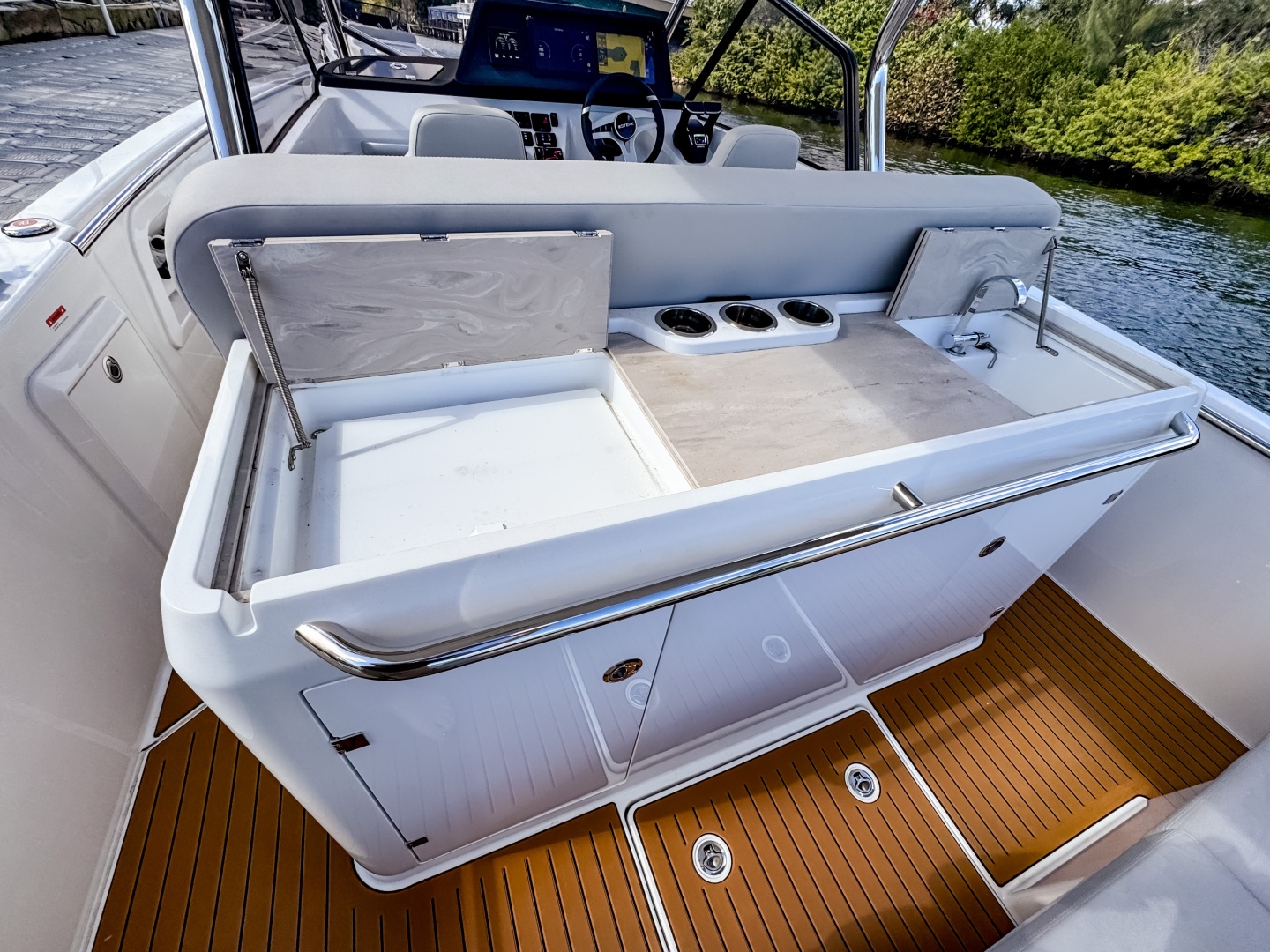 The convertible U-shaped lounge with sunbed transforms the deck into a vibrant social zone—perfect for open-air dining, entertaining, and romantic sunsets. Passenger seats with a leaning function ensure safe, enjoyable cruising. Bow and cabin storage keep everything neatly organized.