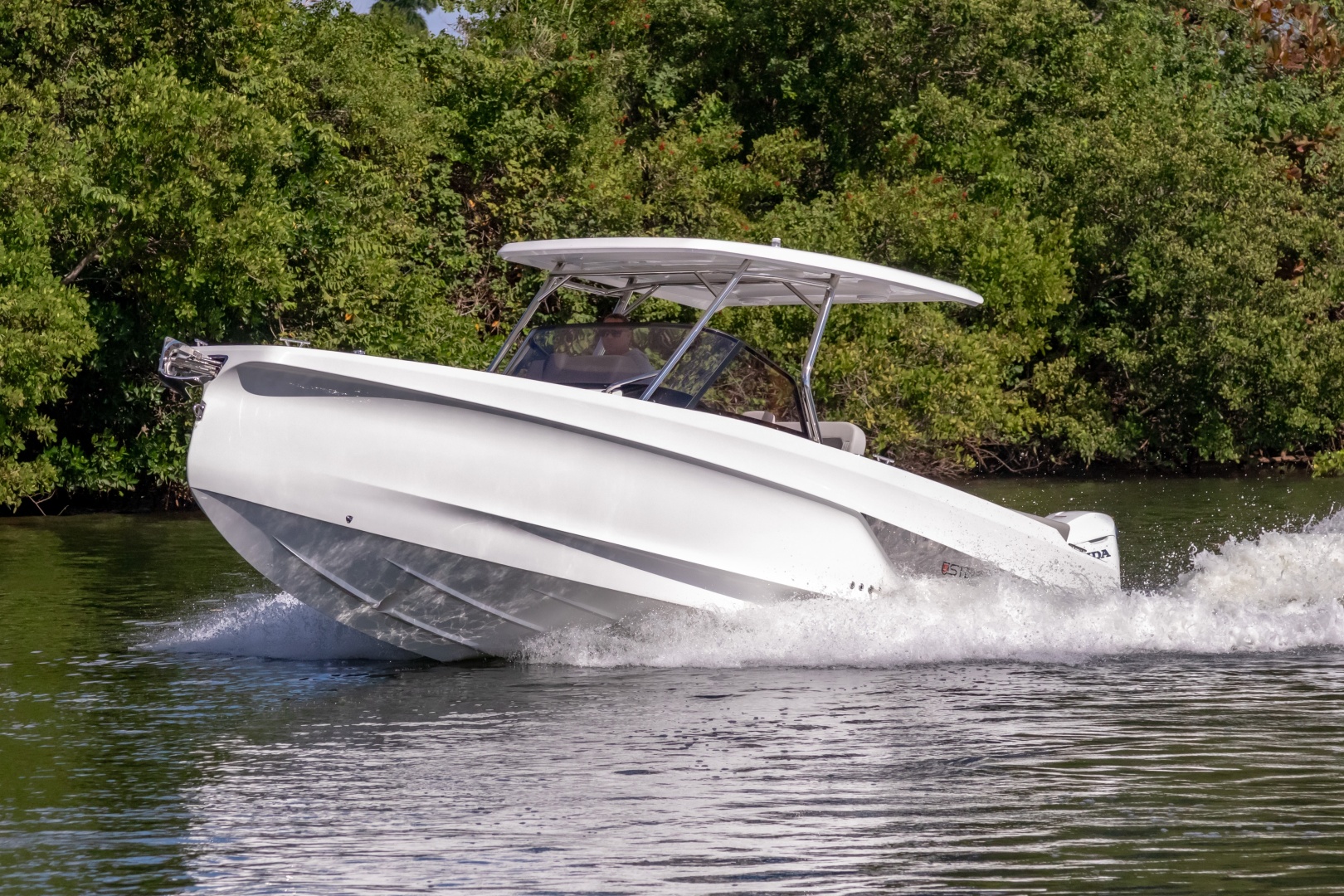 The STERK 31 is a 9.7 m performance boat crafted with passion, featuring modern Mediterranean design, bold lines, and a focus on pure driving pleasure.