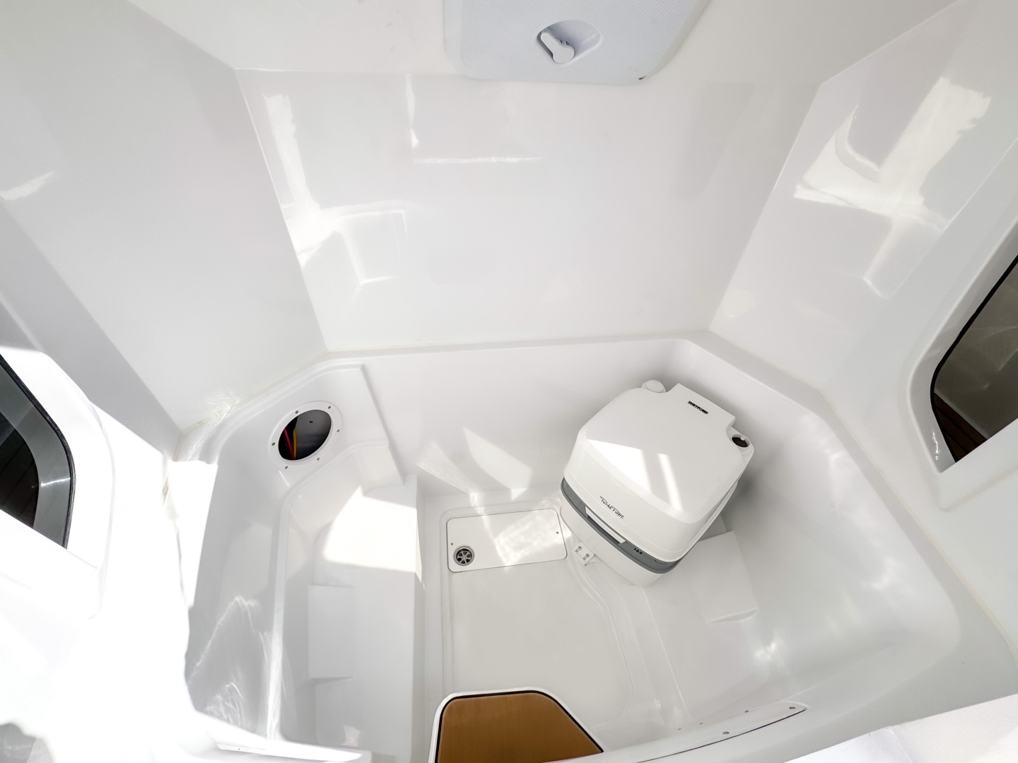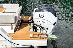 Finished in classic white with silver accents, almond Nautilus upholstery, and EVA soft-teak decking. Equipped with a full electrical system, triple bilge pumps, a C E-certified tank, and a foldable ladder.