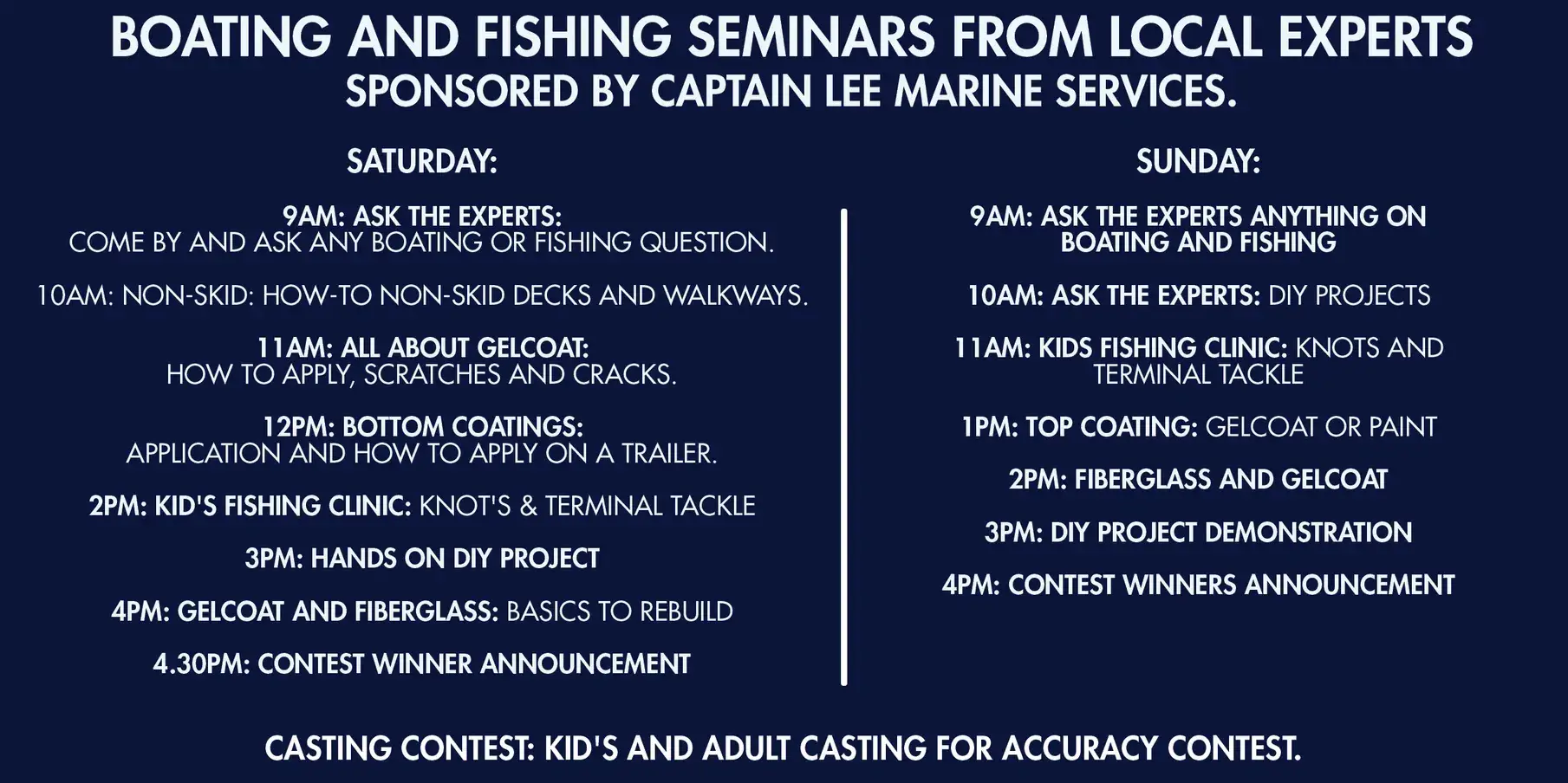 Boating and Fishing Seminars from Local Experts sponsored by Captain Lee Marine Services.